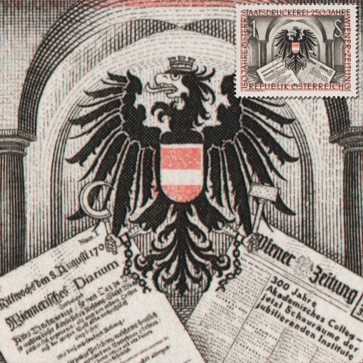 Znaczek upamiętniający 150. rocznicę założenia austriackiej drukarni państwowej i 250. rocznicę powstania wiedeńskiej gazety „Wiener-Zeitung”.