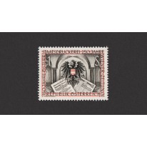 Na znaczku widnieją gazety i herb Austrii na tle sali wystawowej w budynku drukarni państwowej.