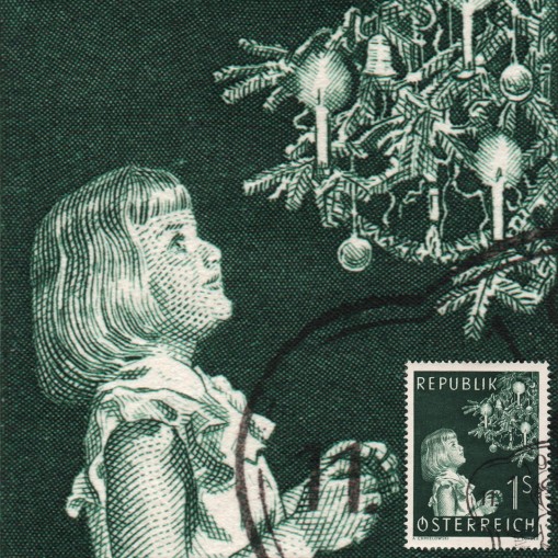 Na znaczku widnieje dziewczynka stojąca przed udekorowaną choinką.