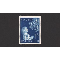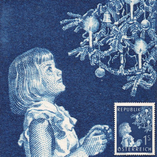Na znaczku widnieje dziewczynka stojąca przed udekorowaną choinką.