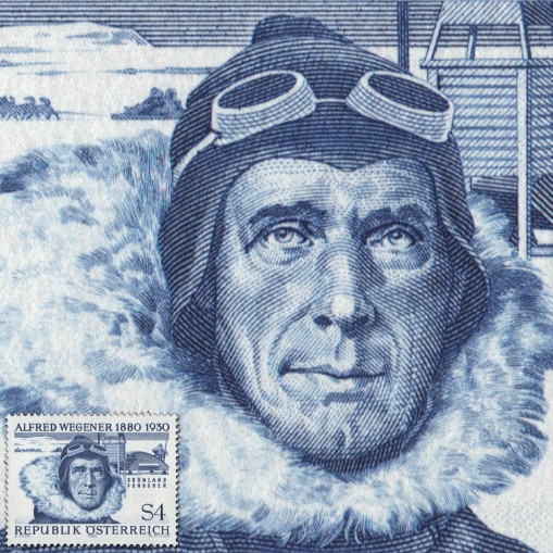 Znaczek upamiętniający setną rocznicę urodzin Alfreda Wegenera, niemieckiego geofizyka, znanego współcześnie dzięki teorii wędrówek kontynentów, nazywanej też teorią Wegenera.