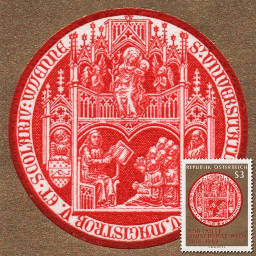 Znaczek upamiętniający 600. rocznicę założenia Uniwersytetu Wiedeńskiego.