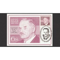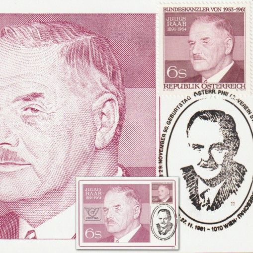 Znaczek na karcie maksimum upamiętniający 90. rocznicę urodzin Juliusa Raaba, konserwatywnego polityka austriackiego, pełniącego funkcję Kanclerza Austrii w latach 1953–1961.