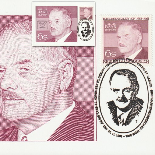 Znaczek na karcie maksimum upamiętniający 90. rocznicę urodzin Juliusa Raaba, konserwatywnego polityka austriackiego, pełniącego funkcję Kanclerza Austrii w latach 1953–1961.