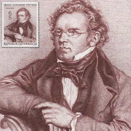 Znaczek upamiętniający 150. rocznicę śmierci Franza Schuberta, austriackiego kompozytora i prekursora romantyzmu w muzyce.