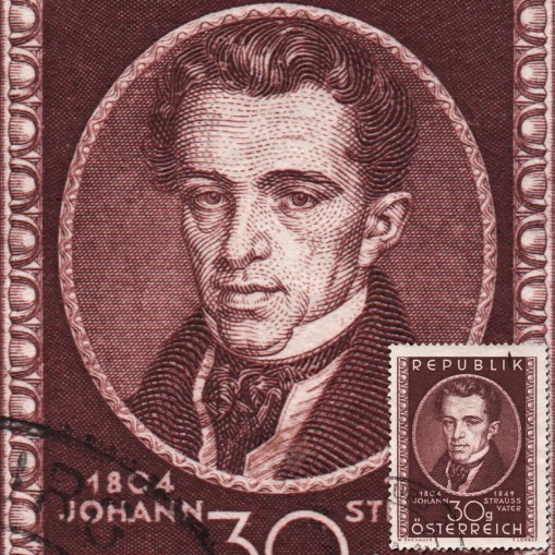 Kasowany znaczek wydany z okazji stulecia śmierci Johanna Straussa (ojca), austriackiego kompozytora okresu romantyzmu. Był on także dyrygentem oraz grał na skrzypcach i altówce. W 1825 założył własną orkiestrę, z którą zdobył ogromną popularność we Wiedniu i w całej Europie. Wkrótce jednak jego sławę przyćmił jego syn – także Johann.
