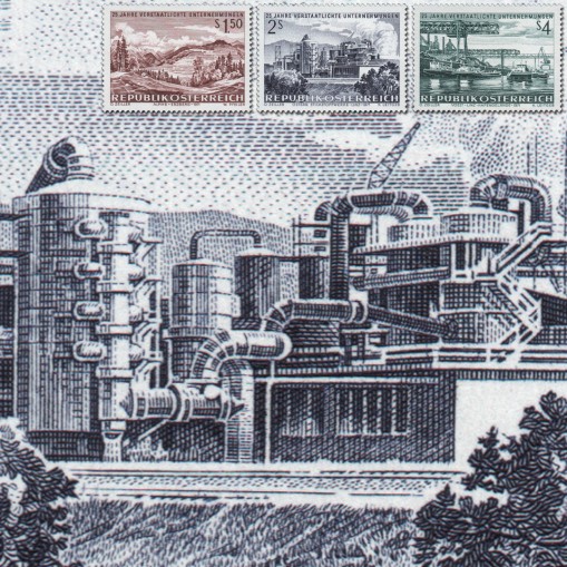 Na znaczkach widnieją kolejno: kopalnia żelaza w Erzberg, fabryka azotu w Linz oraz huta żelaza i stali w Linz.