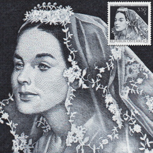 Znaczek upamiętniający stulecie przemysłu koronkarskiego w kraju związkowym Vorarlberg.