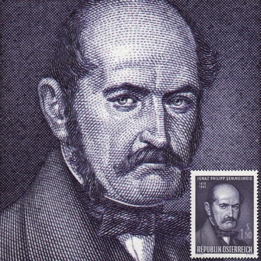 Znaczek upamiętniający setną rocznicę śmierci Ignaza Semmelweisa, lekarza, który położył podwaliny pod nową gałąź medycyny – antyseptykę zajmującą się kwestią niszczenia drobnoustrojów poprzez odkażanie. Zastosowana przez niego dezynfekcja rąk przed badaniem kobiet po porodzie spowodowała radykalne zmniejszenie się wśród nich śmiertelności na gorączkę połogową, która wówczas była zmorą szpitali położniczych.