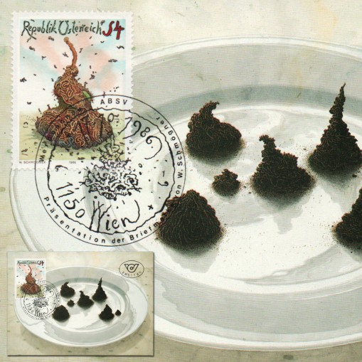Na znaczku widnieje obraz Waltera Schmögnera (*1943) zatytułowany „Dekompozycja”, na karcie zaś jego obraz „Talerz II” z 1980 roku.