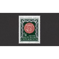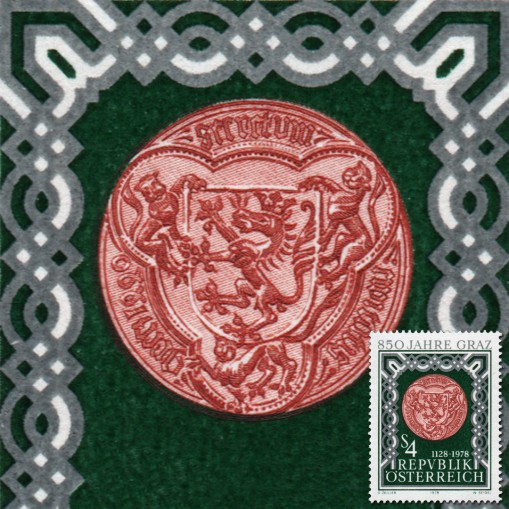 Znaczek upamiętniający 850. rocznicę założenia miasta Graz.