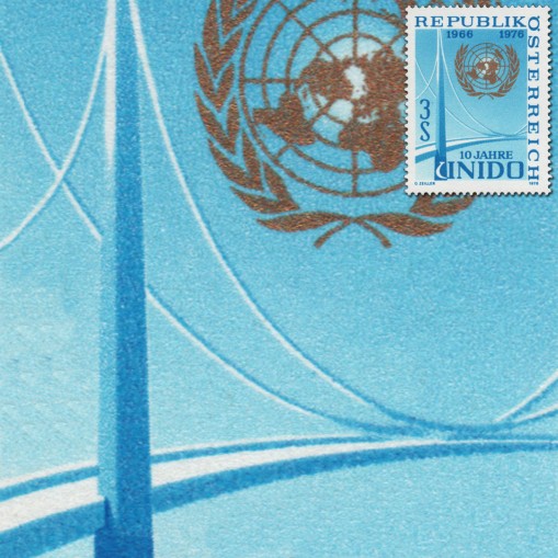 Znaczek upamiętniający dziesiątą rocznicę założenia Organizacji Narodów Zjednoczonych do spraw Rozwoju Przemysłowego.