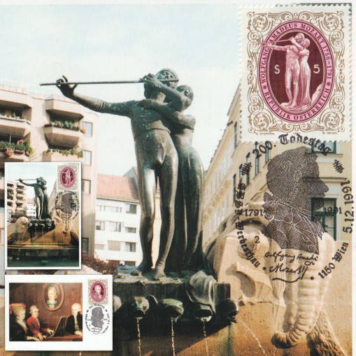 Znaczki na kartach maksimum upamiętniające 200. rocznicę śmierci Wolfganga Amadeusza Mozarta.