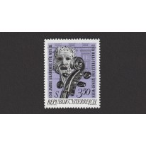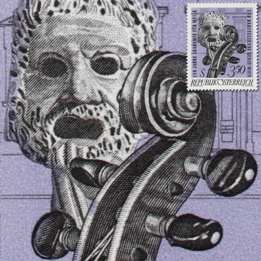 Znaczek upamiętniający 150. rocznicę otwarcia Uniwersytetu Muzyki i Sztuk Scenicznych w Wiedniu, określanego również mianem Konserwatorium Wiedeńskiego.