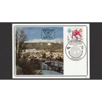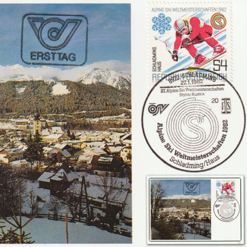 Na znaczku widnieje narciarz, na karcie zaś przedstawiono panoramę miasteczka Schladming.