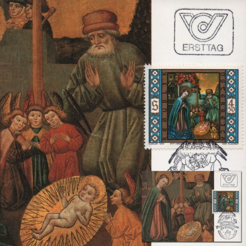 Na znaczku i karcie widnieje obraz z około 1450 roku znajdujący się w kościele w Aggsbach przedstawiający narodziny Chrystusa.