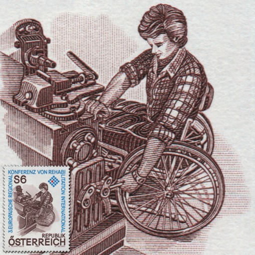 Na znaczku widnieje człowiek na wózku inwalidzkim przy obrabiarce.