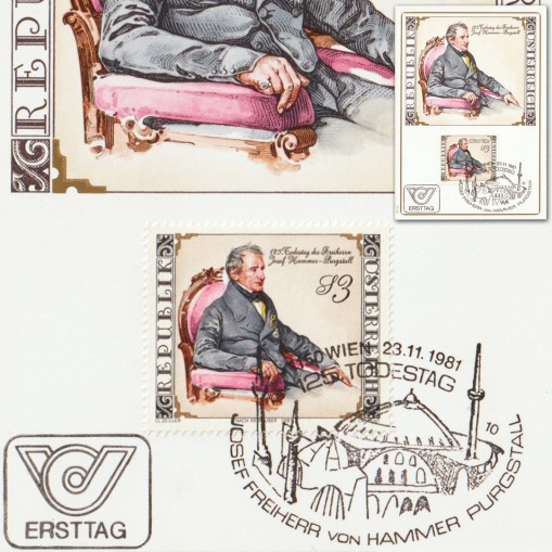 Znaczek na karcie maksimum upamiętniający 125. rocznicę śmierci Josepha von Hammer-Purgstalla, historyka i orientalisty austriackiego. Jego głównym dziełem jest "Historia Imperium Osmańskiego".