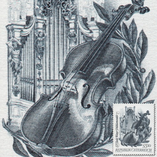 Znaczek upamiętniający 125-lecie istnienia Filharmoników Wiedeńskich (niem. Wiener Philharmoniker), najważniejszej orkiestry w Austrii i jednej spośród bardziej znaczących na świecie.