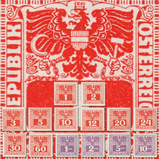 Seria znaczków dopłaty, na których widnieje austriackie godło - orzeł trzymający w szponach sierp i młot.