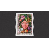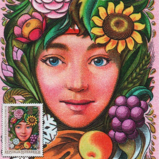 Na znaczku widnieje twarz dziewczyny otoczona owocami i kwiatami.