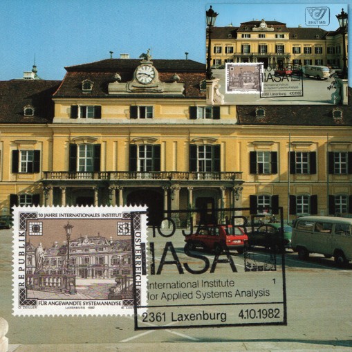 Znaczek na karcie maksimum upamiętniający dziesięciolecie istnienia Międzynarodowego Instytutu Analizy Systemów Stosowanych (ang. International Institute for Applied Systems Analysis, IIASA).