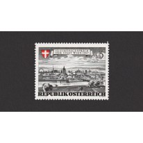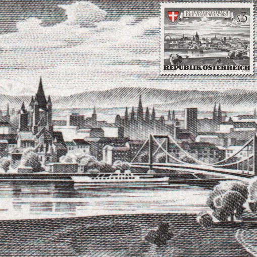 Na znaczku widnieje panorama Wiednia widziana z leżącego nad Dunajem budynku Marschallhof.