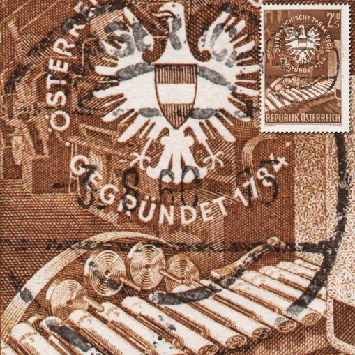 Kasowany znaczek upamiętniający 175. rocznicę powstania firmy „Österreichische Tabakregie” (przekształconej później w „Austria Tabak”) mającej przez wiele lat monopol na sprzedaż tytoniu w Austrii.