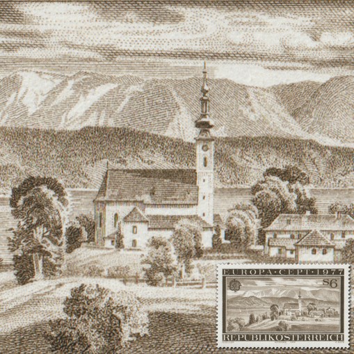 Znaczek z emisji EUROPA CEPT z 1977 roku, której tematem przewodnim były pejzaże.