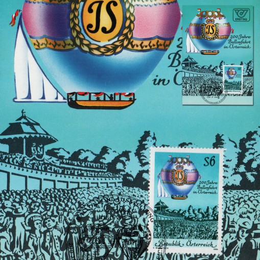 Znaczek na karcie maksimum upamiętniający 200. rocznicę pierwszego lotu balonem w Austrii.