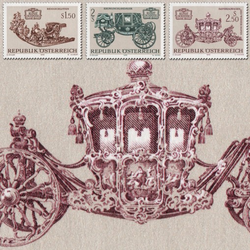 Seria prezentująca austriackie powozy cesarskie, kolejno: