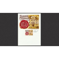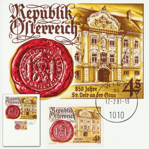Znaczek na karcie maksimum upamiętniający 850. rocznicę założenia austriackiego miasta Sankt Veit an der Glan.