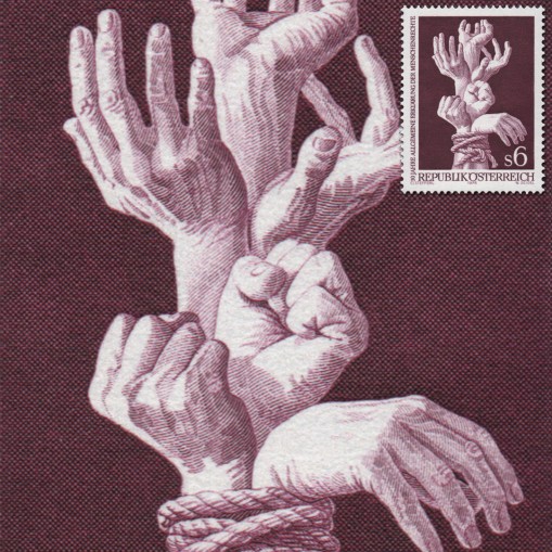 Na znaczku widnieją związane ręce sięgające ku górze.