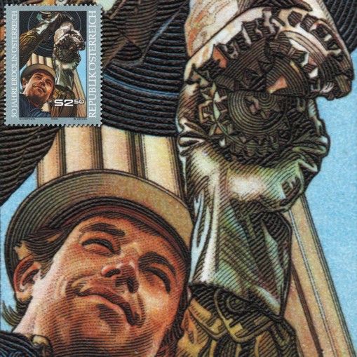 Znaczek upamiętniający 50-lecie wydobycia ropy naftowej w Austrii.