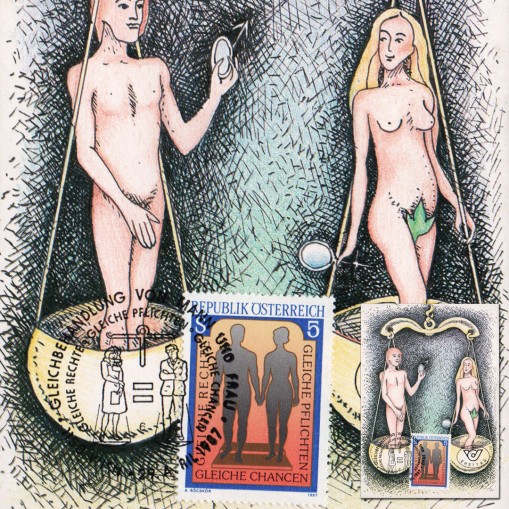 Znaczek na karcie maksimum promujący równouprawnienie mężczyzn i kobiet.