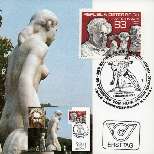 Znaczek na karcie maksimum upamiętniający 50. rocznicę śmierci austriackiego rzeźbiarza czeskiego pochodzenia Antona Hanaka, członka secesji wiedeńskiej.