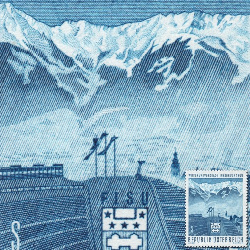 Na znaczku widnieje skocznia narciarska i widok gór Nordkette w okolicach Innsbrucku.