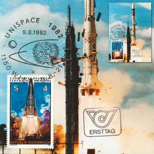 Znaczek na karcie maksimum upamiętniający drugą konferencję Organizacji Narodów Zjednoczonych na temat eksploracji i pokojowego wykorzystania przestrzeni kosmicznej UNISPACE'82 we Wiedniu.