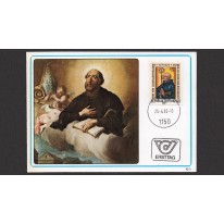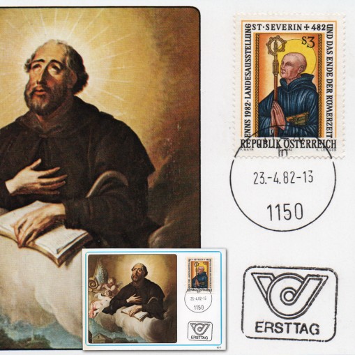 Znaczek na karcie maksimum wydany z okazji wystawy w Enns poświęconej świętemu Sewerynowi.