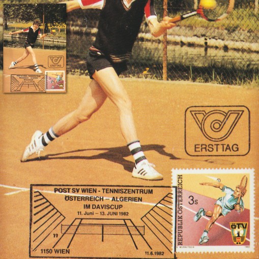 Znaczek na karcie maksimum upamiętniający 80-lecie istnienia austriackiego związku tenisa ziemnego.