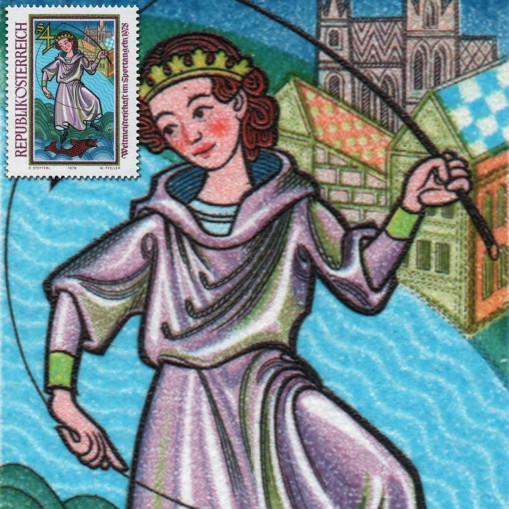 Na znaczku widnieje średniowieczna ilustracja przedstawiająca wędkarza.