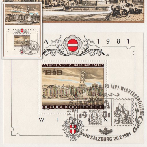 Znaczek w bloku na karcie maksimum wydany z okazji Wiedeńskiej Międzynarodowej Wystawy Filatelistycznej WIPA (niem. Wiener Internationale Postwertzeichen Ausstellung).