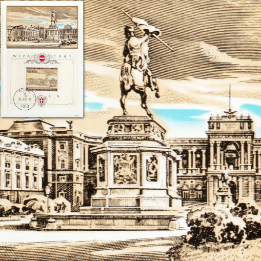 Znaczek w bloku na karcie maksimum wydany z okazji Wiedeńskiej Międzynarodowej Wystawy Filatelistycznej WIPA (niem. Wiener Internationale Postwertzeichen Ausstellung).