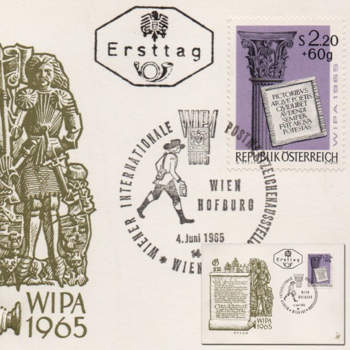 Znaczek na karcie maksimum wydany z okazji Wiedeńskiej Międzynarodowej Wystawy Filatelistycznej WIPA (niem. Wiener Internationale Postwertzeichen Ausstellung).