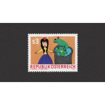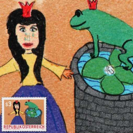 Na znaczku rysunek dziecka ilustrujący baśń braci Grimm "Żabi król".