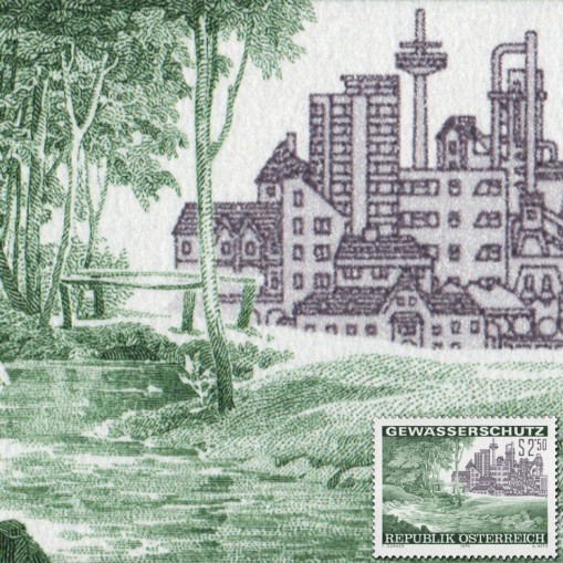 Na znaczku widnieje fabryka obok rzeki płynącej przez las.