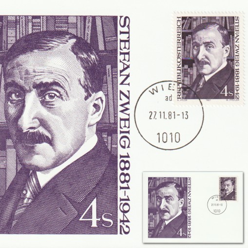 Znaczek na karcie maksimum upamiętniający setną rocznicę urodzin Stefana Zweiga, austriackiego poety, prozaika, dramaturga i tłumacza.