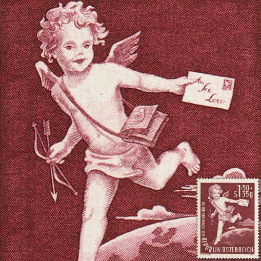 Znaczek przedstawia boga miłości, czyli Amorka, z listem w dłoni.