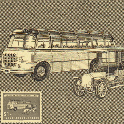 Autobusy pocztowe (POSTAUTO) to sieć masowego transportu autobusowego zorganizowana przez austriacką pocztę. Na znaczku widzimy stary i nowy autobus tego typu.