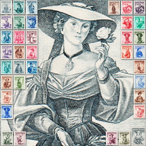Popularne walory przedstawiające kobiece stroje narodowe.